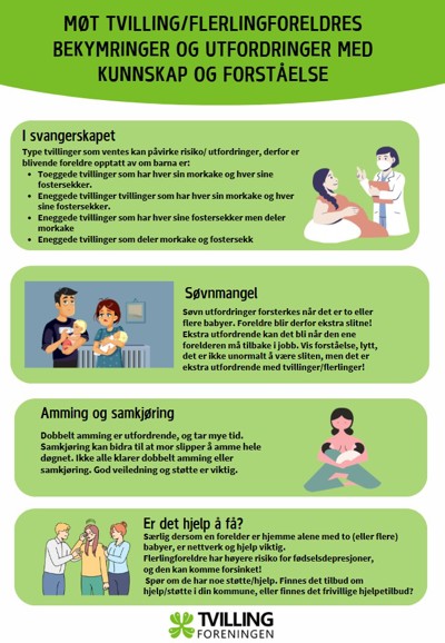 De første nybakte tvilling- og flerlingforeldre møter etter tiden på barsel, er dere på helsestasjonen. Å være nybakte foreldre til tvillinger eller flerlinger er annerledes enn å være nybakte foreldre til en baby. Selv om begge foreldrene er hjemme den første tiden, er det likevel uvant å ta vare på to eller flere babyer samtidig.