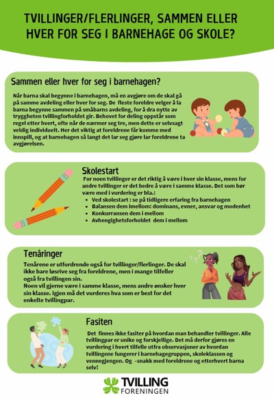 Det er viktig å være klar over at her finnes det ikke en fasit, som passer for alle tvillingsett. Tvillingforeningen har kompetanse og kunnskap om hva som må vurderes før en beslutning tas. Vi har også skrevet artikler om dette tema.